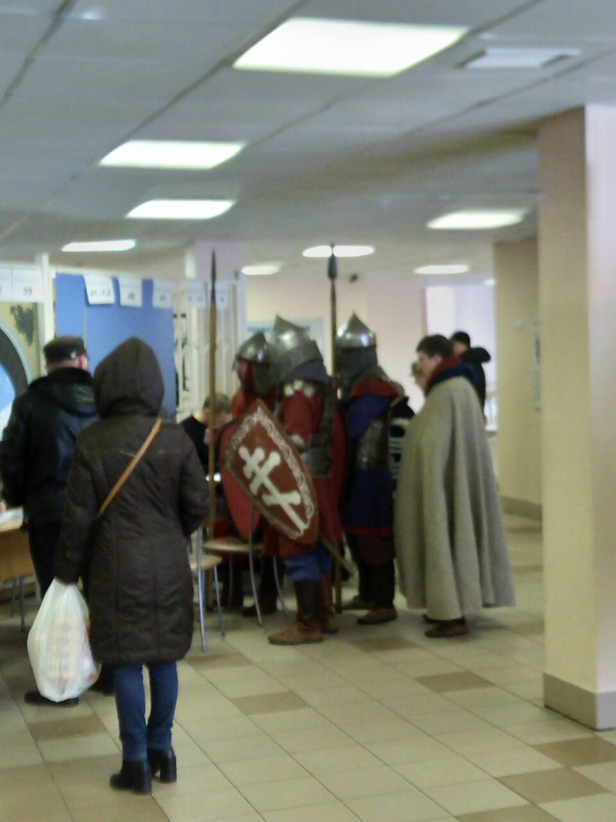 В Санкт-Петербурге на выборы пришли рыцари в доспехах с копьями и щитами.