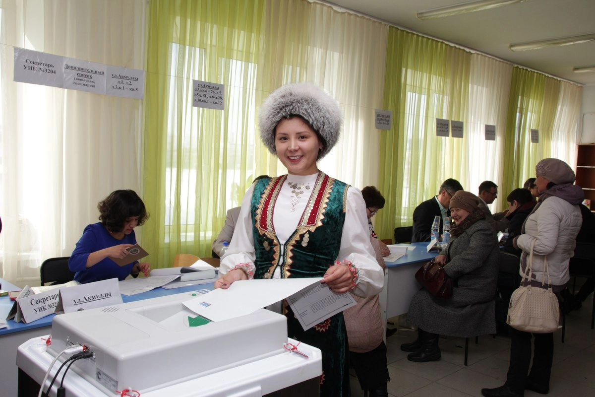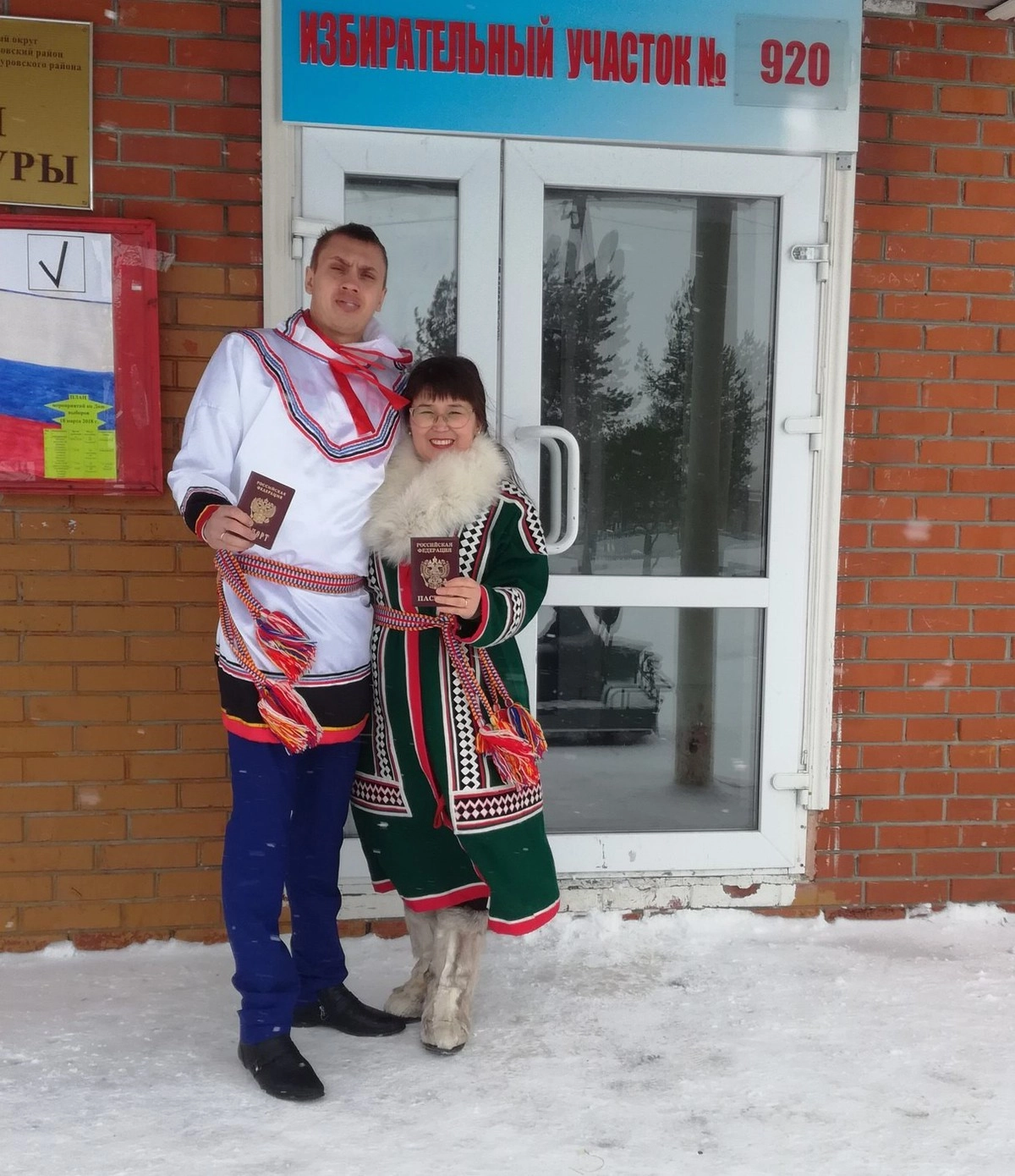 Пара из города Тарко-Сале в Ямало-Ненецком автономном округе и заместитель директора школы в селе Башкортостана тоже пришли на выборы в национальных костюмах, чтобы продемонстрировать многонациональность страны.