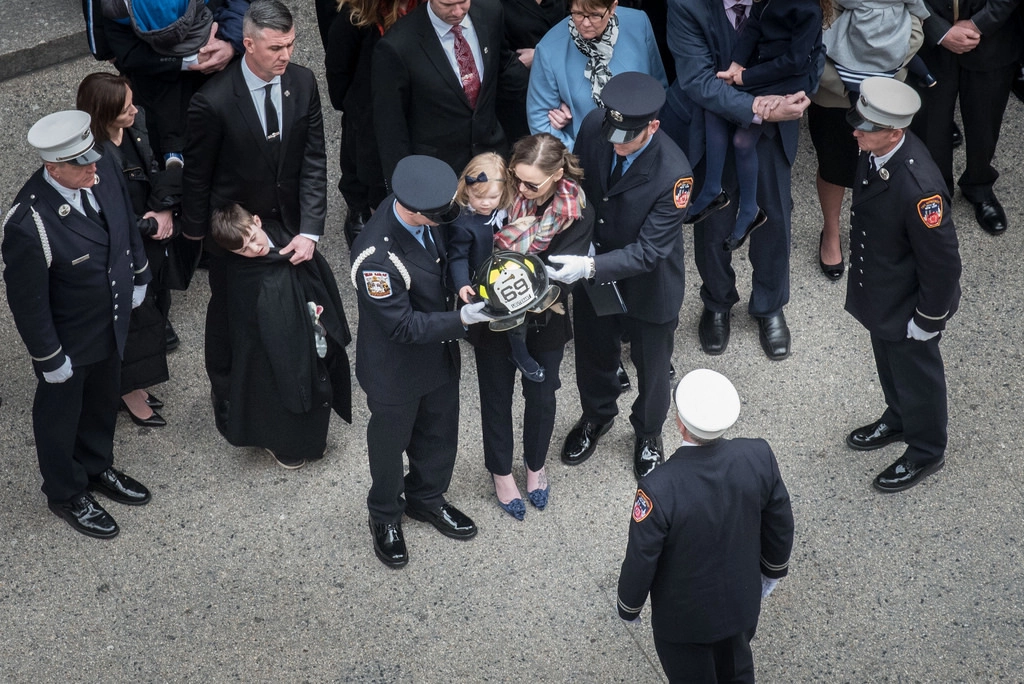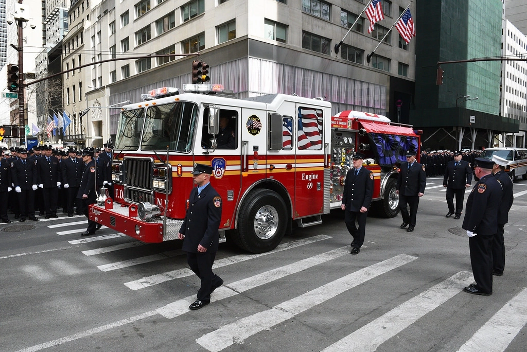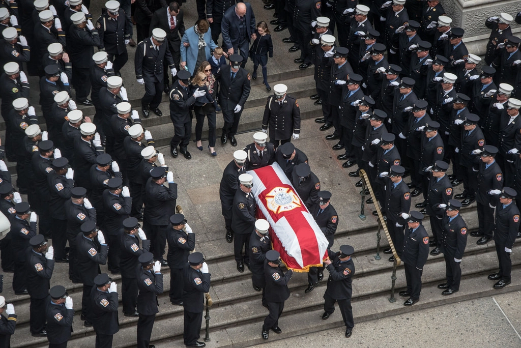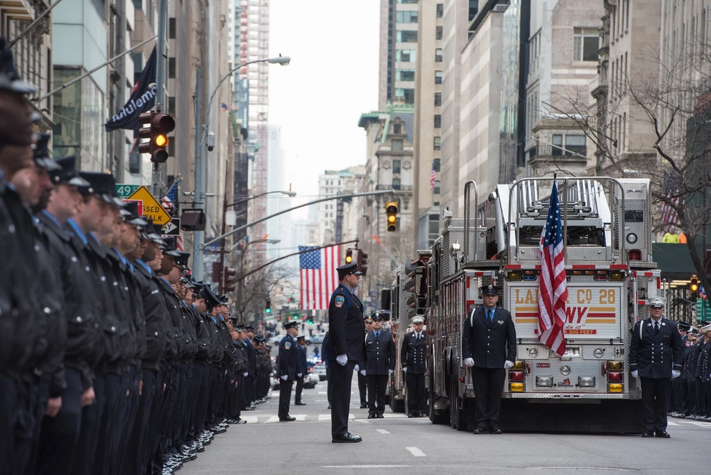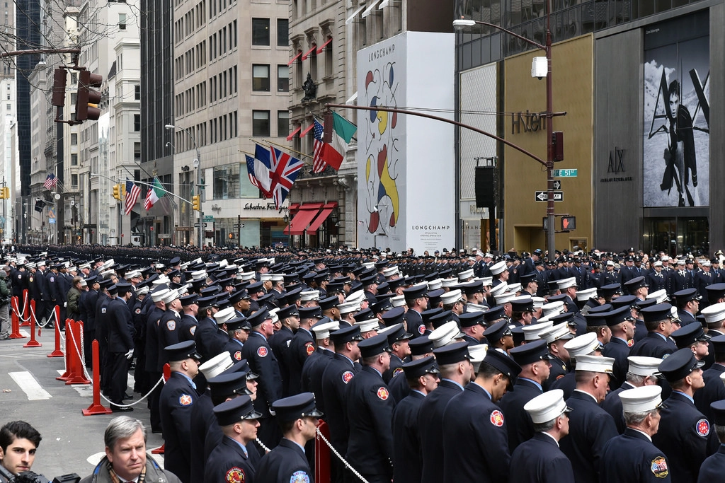 На Пятую авеню приехали мэр города, чиновники, тысячи сотрудников пожарного и полицейского департаментов, а также простые жители Нью-Йорка. Гибель рядового пожарного или полицейского — это всегда трагедия, и почести, которых они удостаиваются при прощании, сравнимы лишь с похоронами разве что президентов, военачальников или политиков очень высокого ранга.