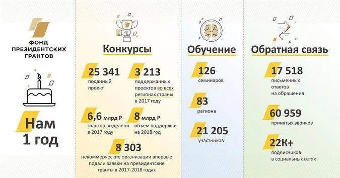 Фонд президентских грантов отметил первую годовщину со дня своего основания. За год работы экспертами фонда было рассмотрено 25 241 заявлений на соискание финансовой помощи из бюджета РФ от 13 796 некоммерческих организаций. Кроме того, фонд выступил организатором 126 семинаров, в которых принимали участие более 20 тысяч человек из всех регионов страны.