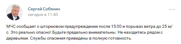 Мэр Москвы Сергей Собянин сообщил на странице «ВКонтакте», что городские коммунальные службы приведены в полную готовность.