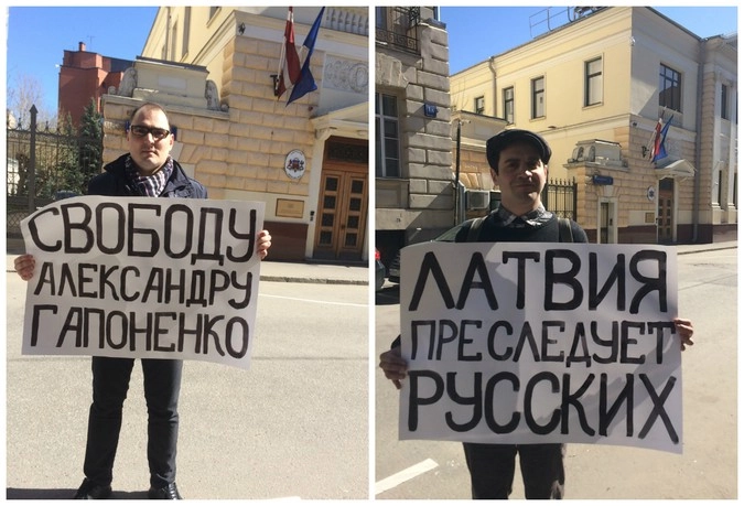 У посольства Латвии в Москве прошла серия одиночных пикетов: активисты выступили в защиту правозащитника, руководителя движения «Конгресс неграждан» и активиста штаба защиты русских школ Александра Гапоненко, арестованного в Риге.