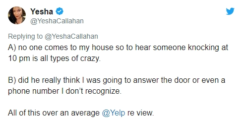 Йеша Каллаган из города Стерлинг, штат Вирджиния, имела неосторожность заказать доставку еды в местном ресторане «Ля Порчетта» и оставить о нем негативный отзыв. Посредственные вкусовые характеристики блюд оказались лишь меньшим из зол — ночью в дверь ее дома неожиданно постучался менеджер заведения.