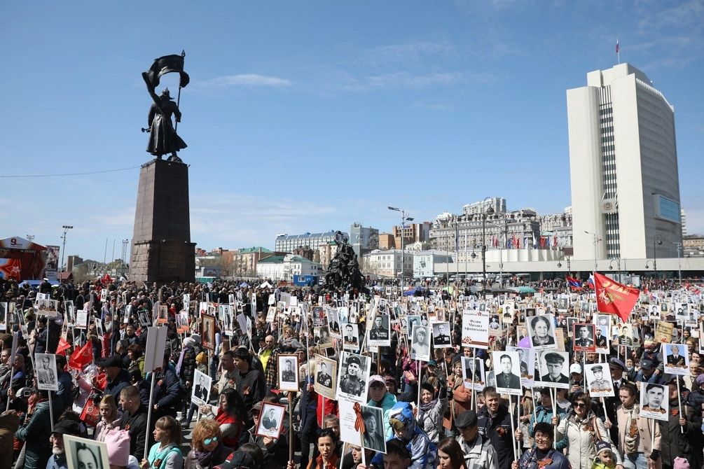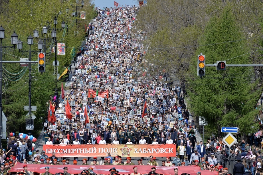 В Хабаровске около 60 тысяч человек пронесли фотографии участников Великой Отечественной под звуки песен военных лет в колонне, прошедшей по маршруту от площади имени Ленина до мемориального комплекса площади Славы.