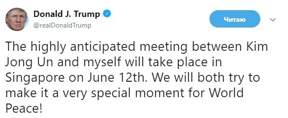 «Столь ожидаемая встреча Ким Чен Ына со мной произойдет в Сингапуре 12 июня. Мы оба постараемся, чтобы она стала очень важным моментом для мира во всем мире», — говорится в посте.