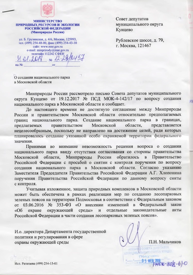 Но к февралю 2016 года что-то пошло не так. Минприроды обратилось в правительство России с просьбой снять контроль с вопроса о создании национального парка «Московия».