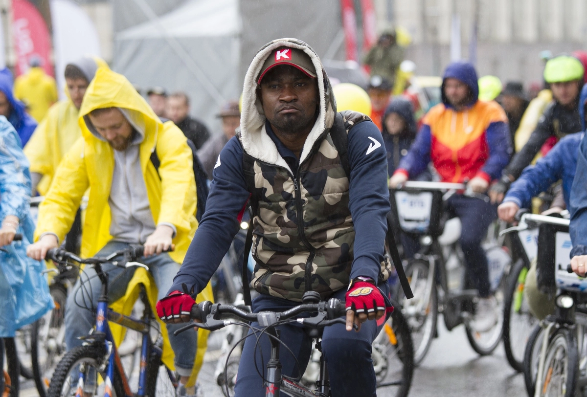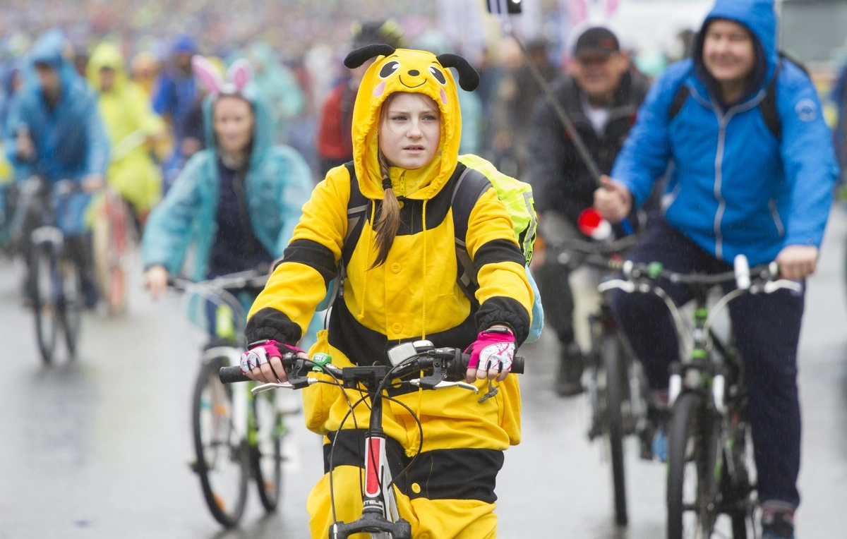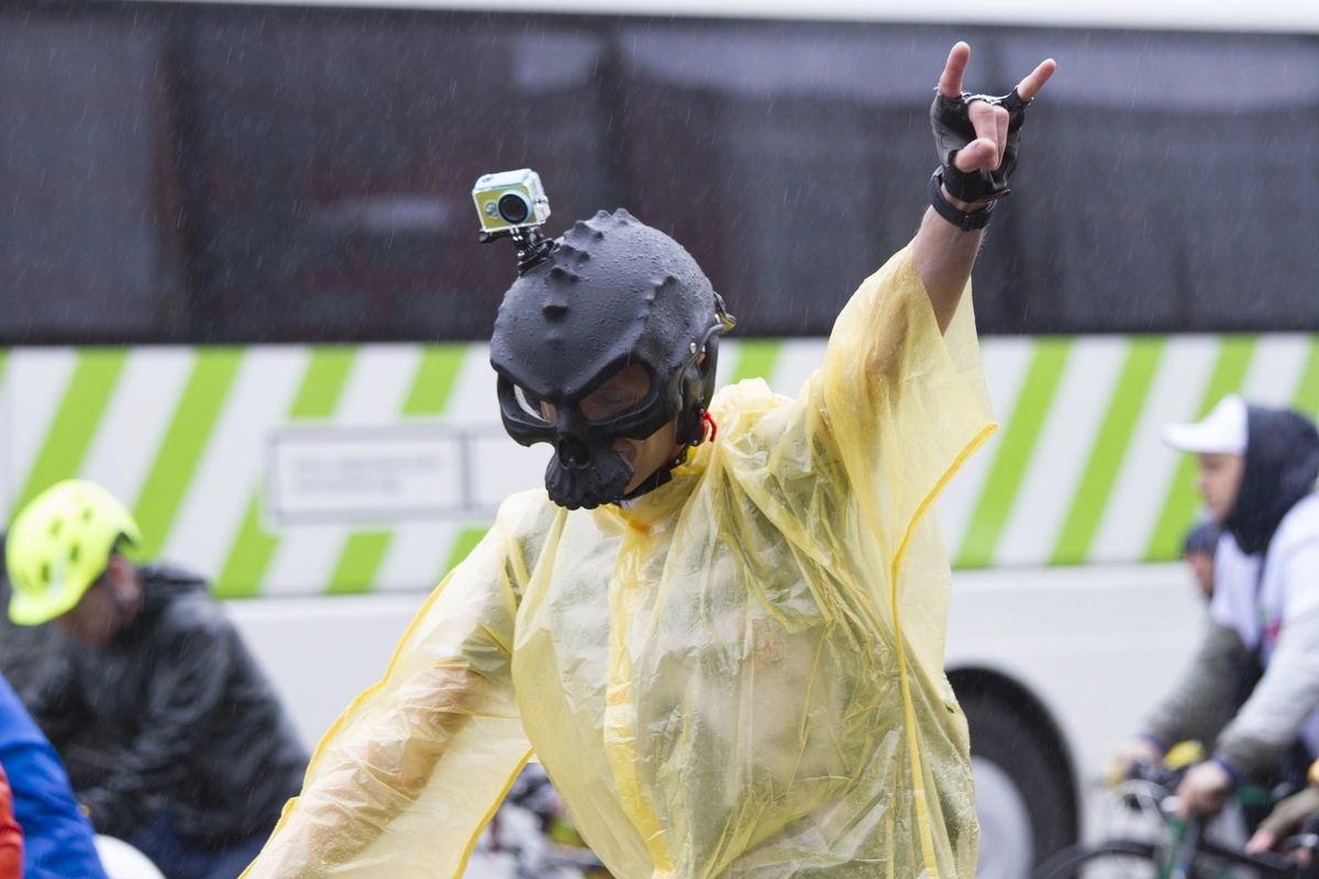 Лица 30 тысяч велосипедистов под проливным дождем в центре столицы