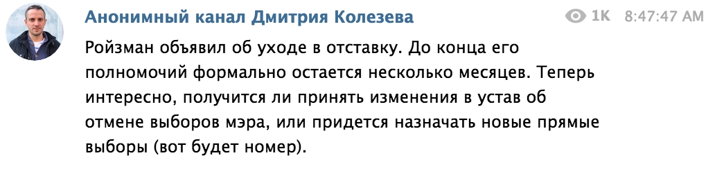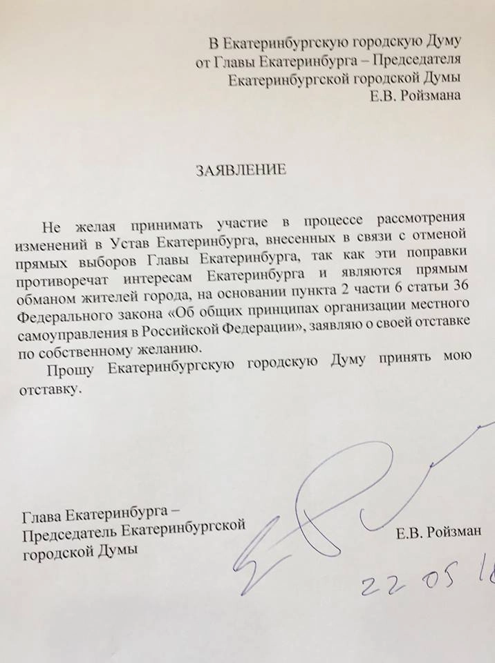 Глава Екатеринбурга Евгений Ройзман подал в отставку с поста. Свое решение он связал с отменой прямых выборов мэра: «Прямой обман жителей и предательство интересов города. Не стану в этом участвовать», — написал Ройзман в Twitter.