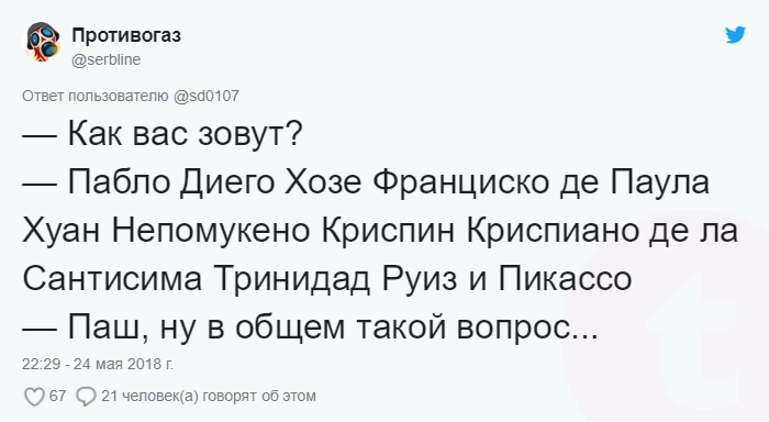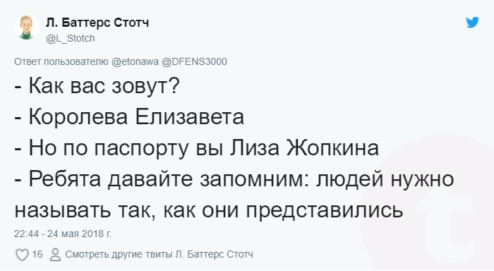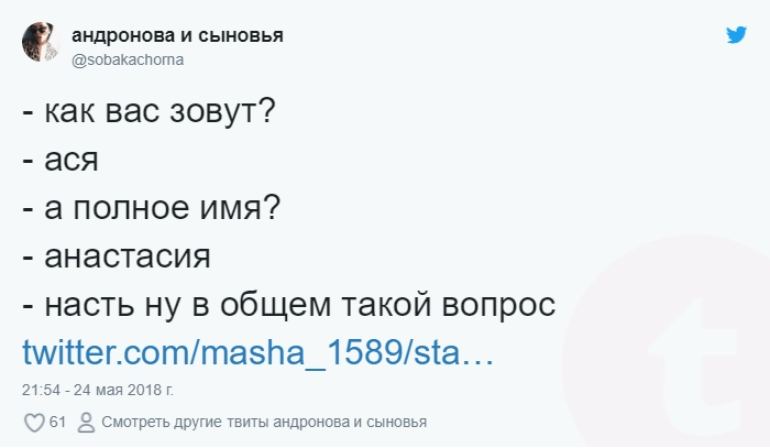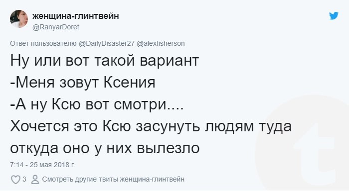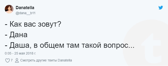 Психологи уверены: самый приятный для человека звук — это звук его имени. Однако некоторые люди не только не дают себе труд запомнить имя собеседника, но ещё и искажают его так, что тут уж не до приятных ощущений. В мире действительно много сложных и неоднозначных имён, поэтому тут следует руководствоваться правилом: «Обращаться к человеку именно так, как он представился». Эту мысль написала на своей страничке в Twitter микроблогерша Александра Васильевна, чем положила начало целому флешмобу. Пользователи стали делиться личными историями на тему коверканья имён и, конечно, не упустили возможности поюморить на эту тему. Собрали для вас самые смешные посты.