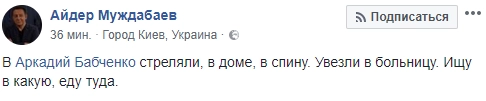 «В Аркадия Бабченко стреляли, в доме, в спину. Увезли в больницу», — написал Муждабаев в Facebook.