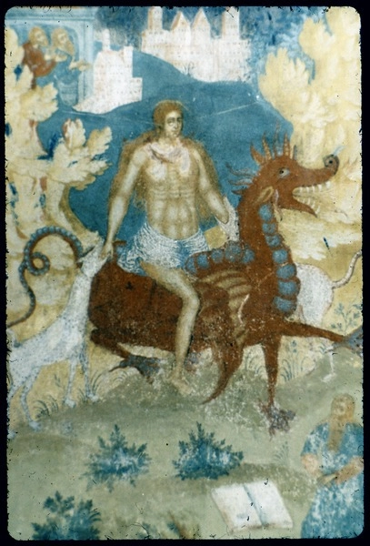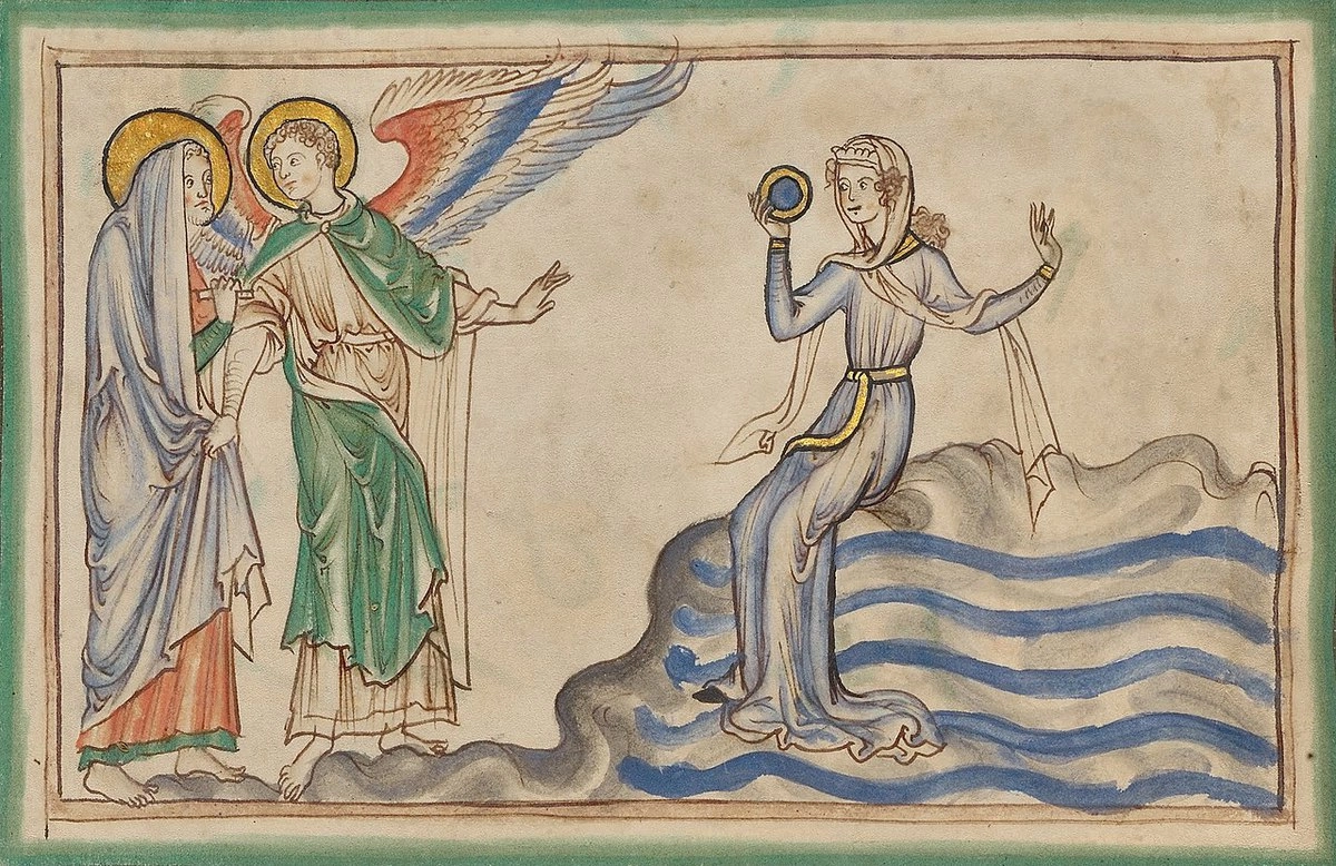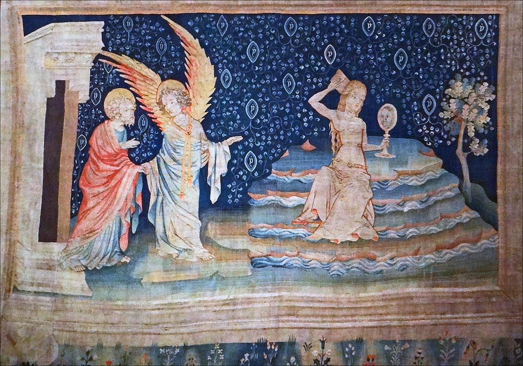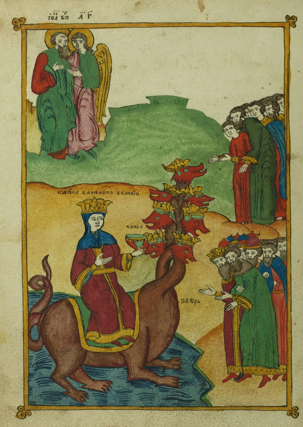 — Смотри, я покажу тебе, какая кара ждет Великую Шлюху, сидящую у многих рек. В расширеной иконографии Вавилонская блудница сначала показывается «сидящей на водах», а не на звере. Вот этот редкий вариант изображения, причем она по идее не в зеркало смотрится, а чашу держит. Воды, на которых сидит Блудница — образ, взятый из древних пророчеств, обличавших Вавилон (город Междуречья), в следующих строках главы это уже и обозначение народов, говорящих на многих языках, некоего шума, смешения.