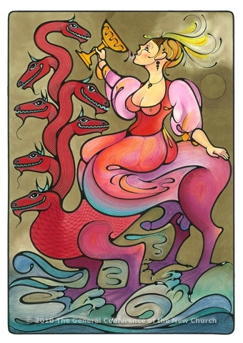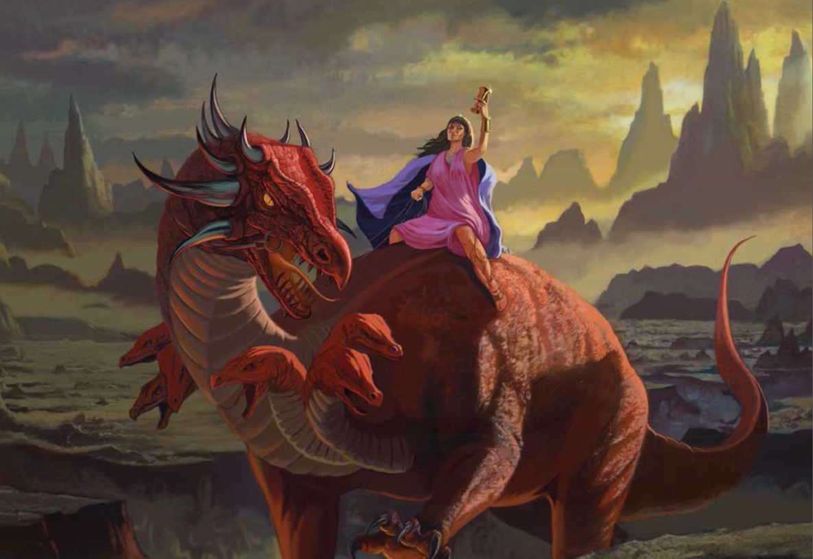 Однако с этим зверем возникает у комментаторов некий затык. Дело в том, что непонятно, что это за зверь-то (можете освежить в памяти зоопарк предыдущих глав, глядя на набор карточек). По тексту текущей главы, он багряный (красный), у него 7 голов и 10 рогов, и он целиком покрыт кощунственными именами (титулами цезарей типа «божественный» или «спаситель»).