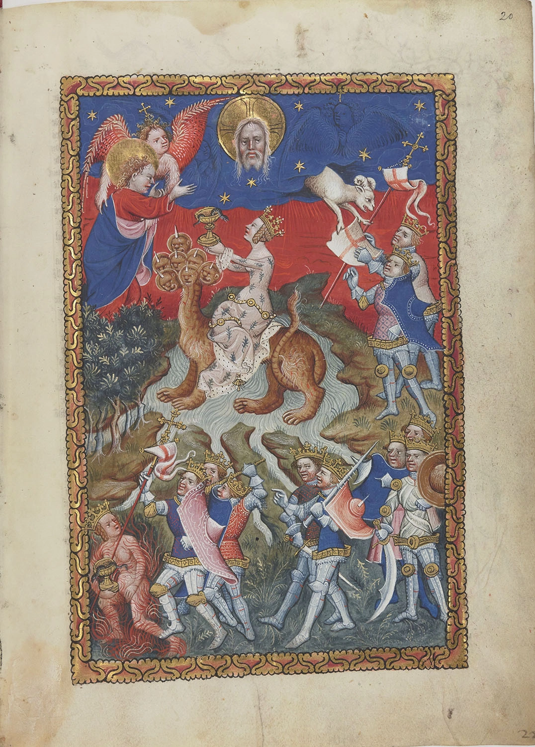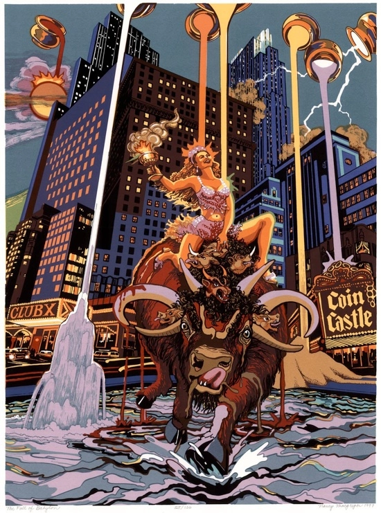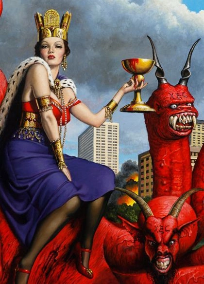 Про символику вод мы уже говорили выше. На этой картинке много чего совмещено -- Зверь багряный изображен как Зверь, выходящий типа из моря. В небесах опустошаются 7 чаш гнева божьего из предыдущей главы. На заднем плане -- текущая империя зла, которая уже не Рим, а нечто более знакомое нам.