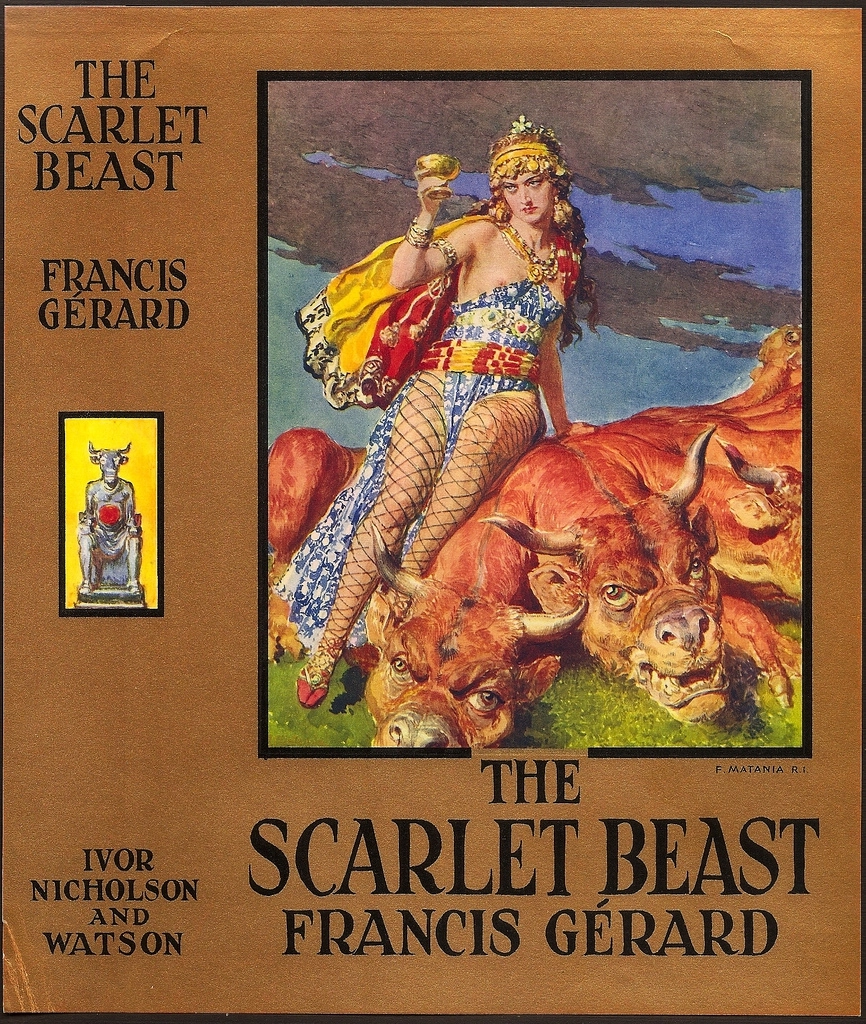 Автор этой иллюстрации считал Зверя багряного Блудницы -- Зверем из моря, которого принято рисовать с леопардовой шкуркой. Кстати, далее по тексту ангел дает расшифровку значений голов и рогов Зверя багряного -- иногда эти слова используют для объяснения голов Зверя из моря, но, как мы видим, это отождествление не железное.