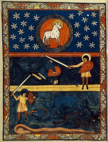 В предыдущих главах у нас уже было два персонажа с таким же набором числительных: Красный дракон (сатана) и леопардовый Зверь из моря (антихрист), причем у второго имена были только на голове. Одни комментаторы отождествляют нового «Зверя багряного» с драконом, другие со Зверем из моря; единого мнения нету.