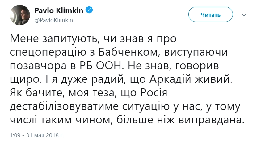 «Меня спрашивают, знал о спецоперации по Бабченко, выступая позавчера в СБ ООН. Не знал, говорил искренне. И я очень рад, что Аркадий жив. Как видите, мой тезис, что Россия дестабилизирует ситуацию у нас, тогда же образом, больше чем оправдана», — написал Климкин в своем Twitter.