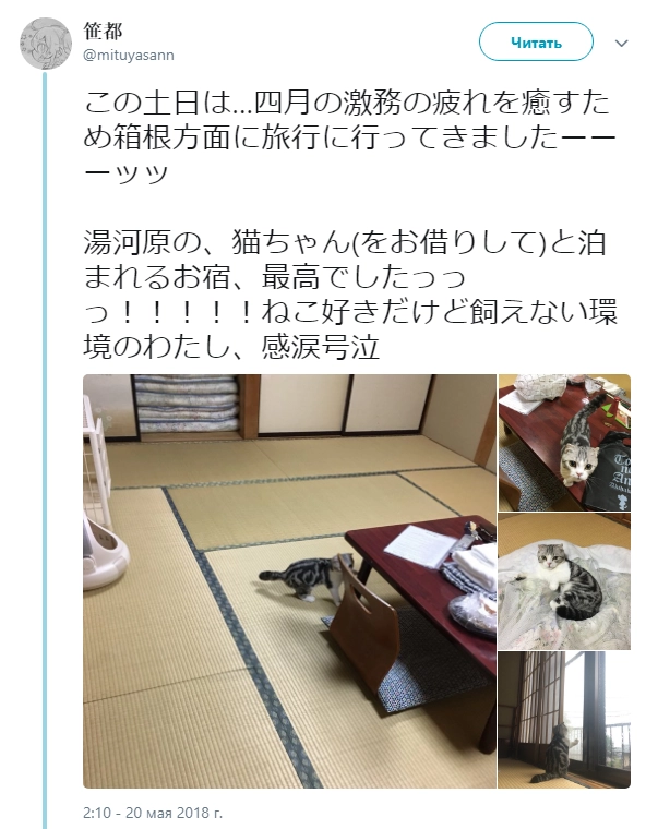 Небольшой японский отель, расположенный на термальном курорте Хаконэ, распродал номера на несколько месяцев вперед, благодаря необычной услуге: аренде «кота на час».