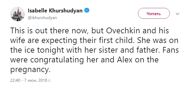 Обозреватель Washington Post Изабель Хуршудян опубликовала твит, в котором рассказала о беременности супруги Овечкина Анастасии.