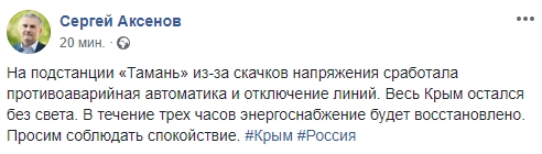Глава республики Сергей Аксенов пообещал, что энергоснабжение Крыма будет восстановлено в течение трех часов. Об этом он написал на своей странице в Facebook.
