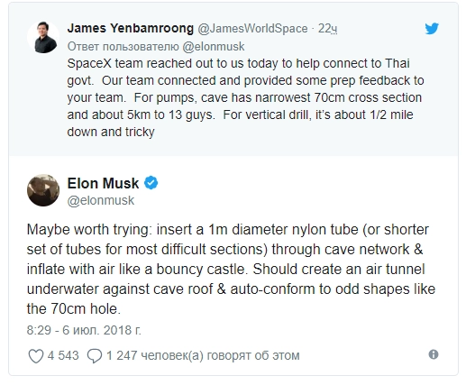 Известный американский изобретатель и миллиардер Илон Маск придумал, как вызволить юных футболистов из частично затопленной пещеры в Таиланде. Он предложил протянуть под водой нейлоновую трубу диаметром 1 метр и надуть ее воздухом, чтобы получился подводный тоннель. Об этом глава SpaceX сообщил на своей странице в Twitter.