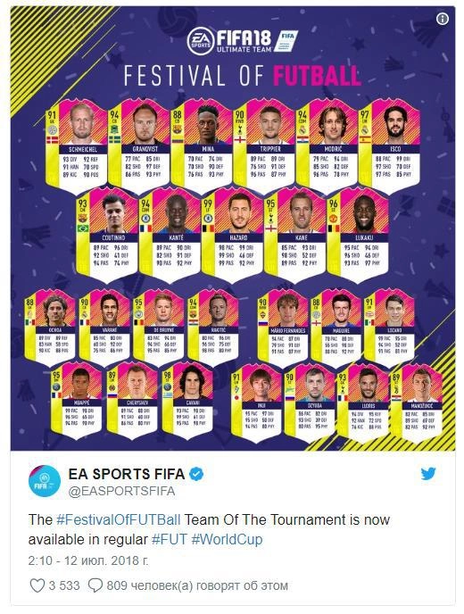 Разработчик серии видеоигр FIFA компания EA Sports представила символическую сборную ЧМ-2018. В команду лучших игроков вошли российские футболисты: защитник Марио Фернандес, полузащитник Денис Черышев и нападающий Артем Дзюба.