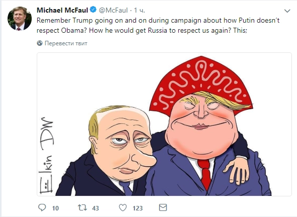 «Помните, во время президентской кампании Трамп говорил, что Путин не уважает Обаму? Как он может заставить Россию снова уважать нас? Так».