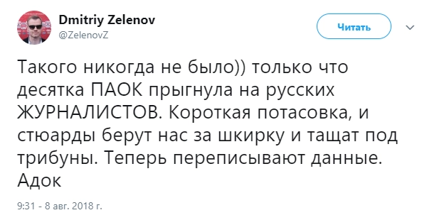 «Такого никогда не было. Только что десятка ПАОК прыгнула на русских журналистов», — написал Зеленов.