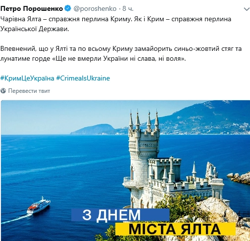 «Уверен, что в Ялте и по всему Крыму будет развеваться сине-желтый стяг и будет звучать гордое «Ще не вмерли України ні слава, ні воля», — добавил украинский лидер.