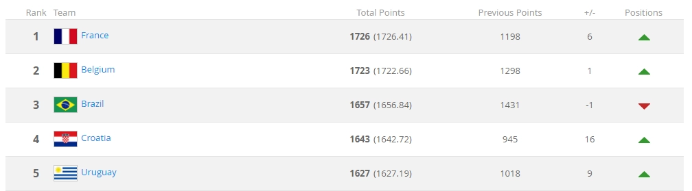 В первой пятерке — Франция, Бельгия, Бразилия, Хорватия и Уругвай.