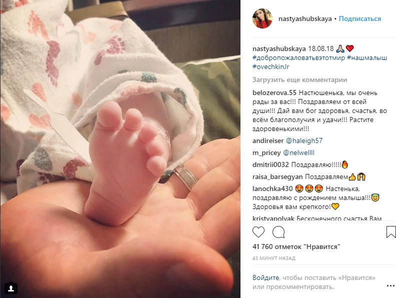 Российский хоккеист, форвард клуба «Вашингтон Кэпиталз» Александр Овечкин и актриса Анастасия Шубская стали родителями. Фотографию ребенка молодая мама выложила в своем аккаунте в Instagram.