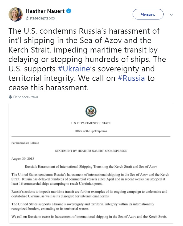 «США осуждают российские гонения на международное судоходство в Азовском море и Керченском проливе, выраженные в препятствии морскому транзиту и задержании сотен судов. США поддерживают суверенитет и территориальную целостность Украины. Мы призываем Россию прекратить преследования», — написала Науэрт в сопроводительном абзаце.