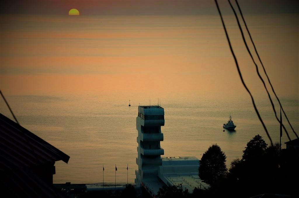 Внезапно шикарный вид на закат и грузинский пограничный катер внизу.