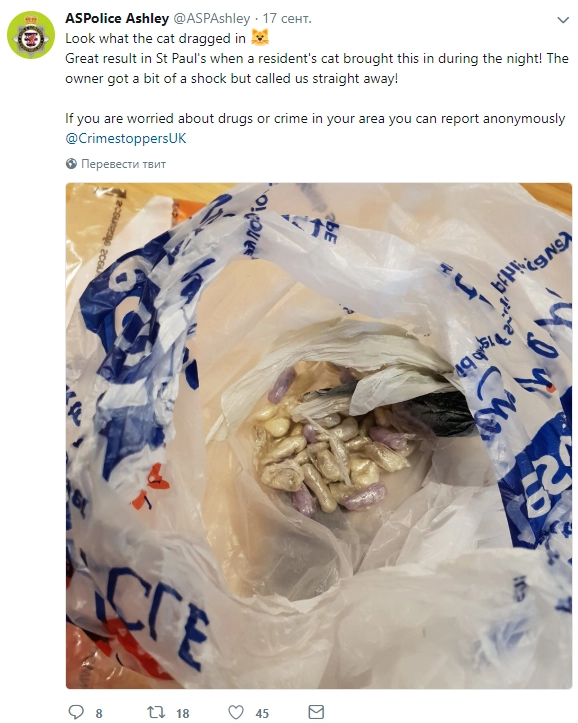 Житель британского города Сент-Пол в пригороде Бристоля испытал шок после того, как его кошка принесла домой пакет с наркотиками.