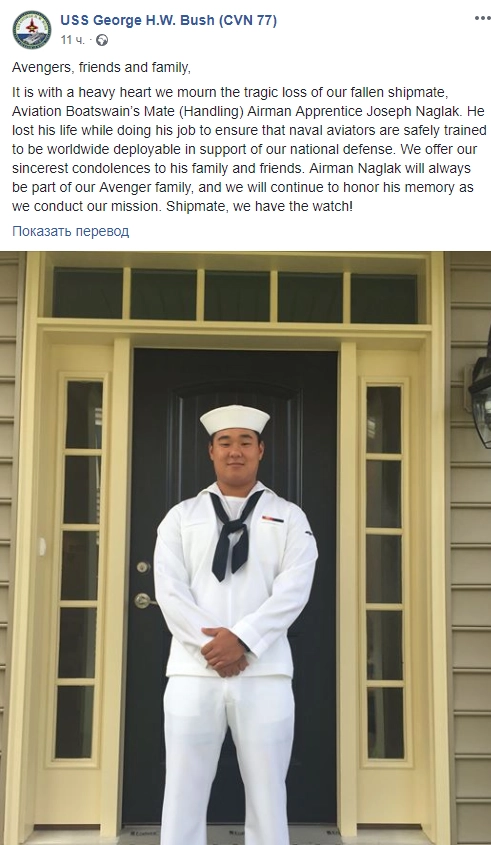 Экипаж авианосца выразил соболезнования родственникам погибшего на своей странице в Facebook.