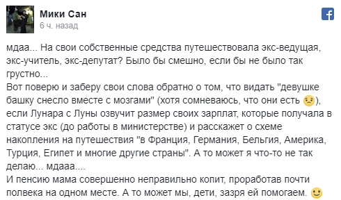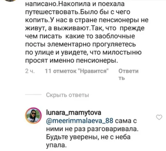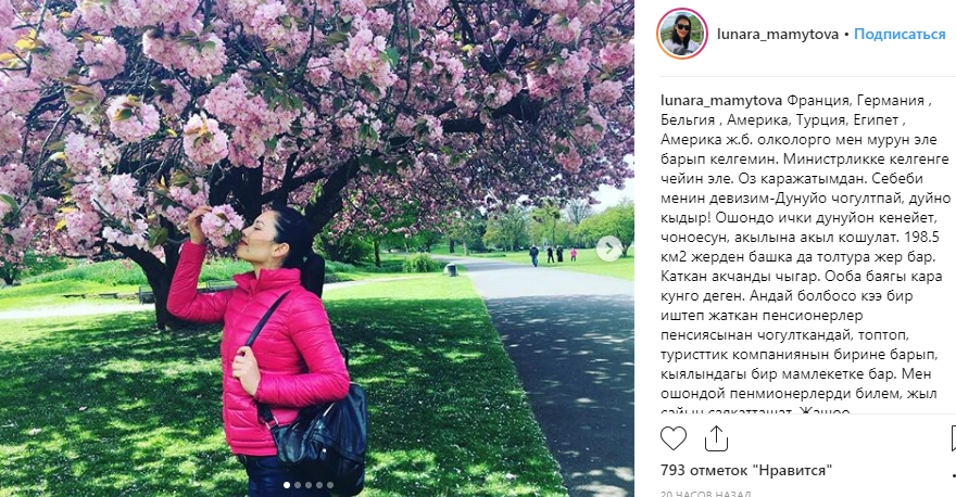 «Франция, Германия, Бельгия, Америка, Турция, Египет и многие другие страны, где я побывала ранее еще до своей работы в министерстве и на свои собственные средства. Мой девиз: „Важно не богатство, а мир посмотреть“», — написала Мамытова.