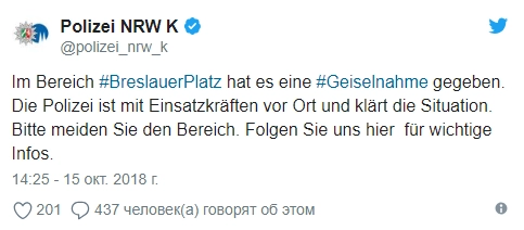 Полиция сообщила, что в районе главного вокзала Кельна неизвестные захватили заложников. Число удерживаемых людей неизвестно. Правоохранители рекомендовали жителям и гостям города воздержаться от посещения площади Бреслауэрплац.