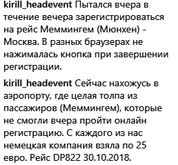 Почти сразу же пассажиры стали сообщать, что на стойке регистрации в аэропорту с них потребовали за услугу по 25 евро (2500 рублей) По словам многих, они пытались зарегистрироваться на сайте авиакомпании, но им не удалось этого сделать. Страница просто не работала.
