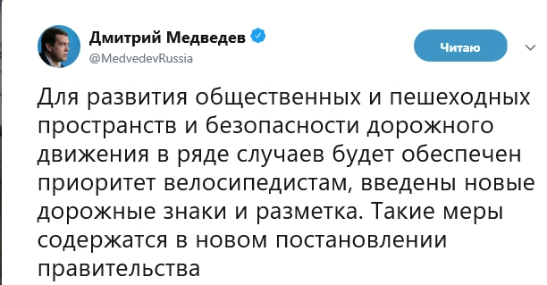 Для обозначения этих участков будут введены новые дорожные знаки и разметка, сообщил в своем аккаунте в Twitter премьер-министр РФ Дмитрий Медведев.