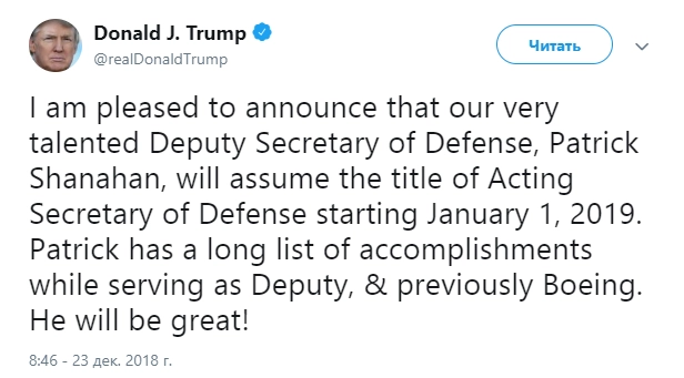 Рад объявить, что наш очень талантливый заместитель главы Пентагона Патрик Шанахан с 1 января 2019 года станет исполняющим обязанности министра обороны. У Патрика отличный послужной список, как на его прошлой должности, так и за время работы в Boeing. Он отлично справится! — написал Трамп.