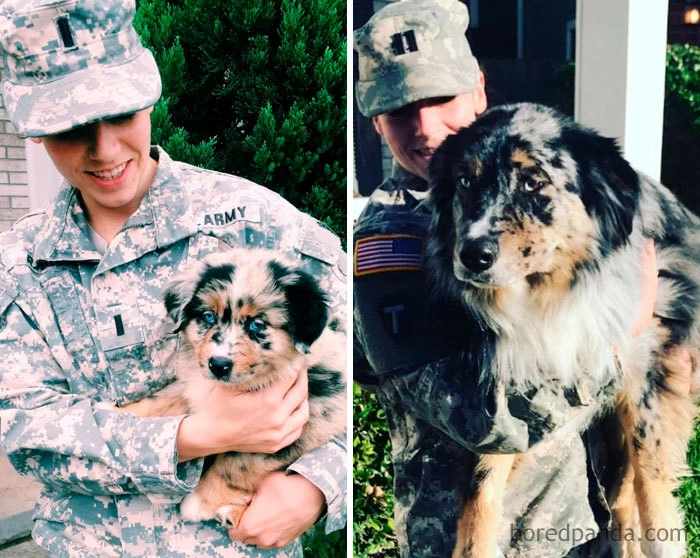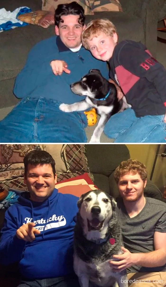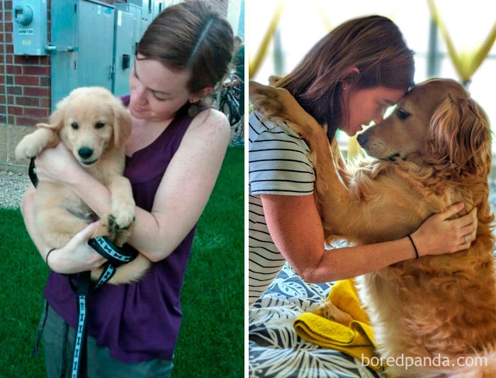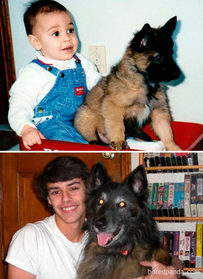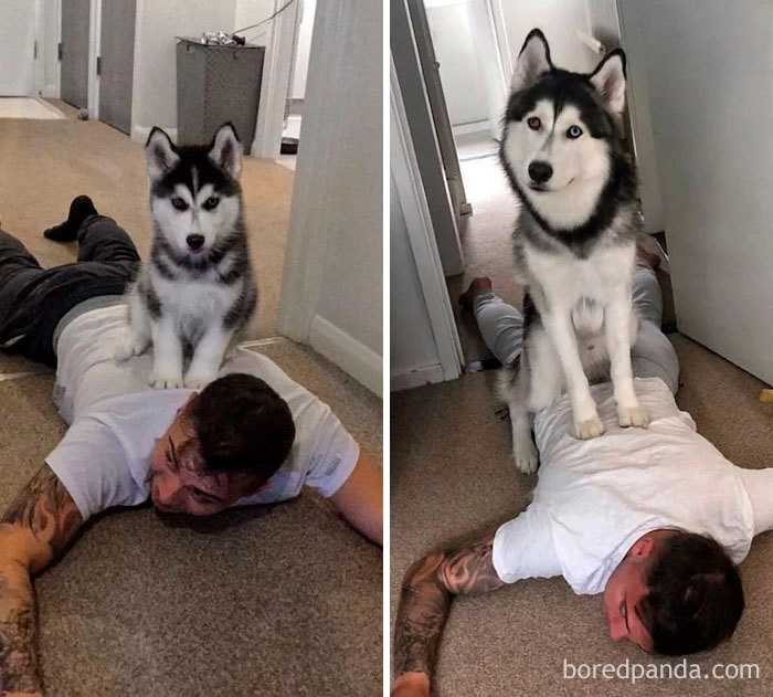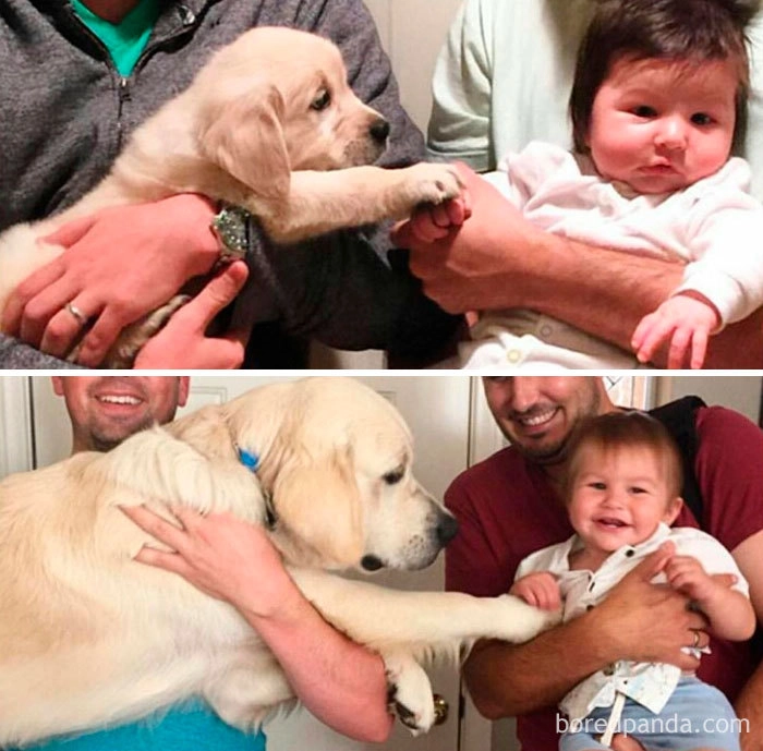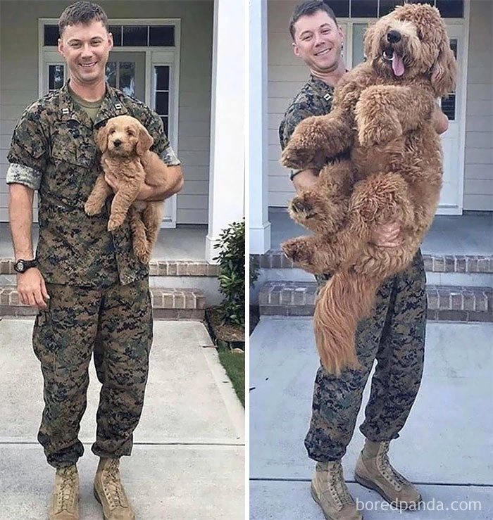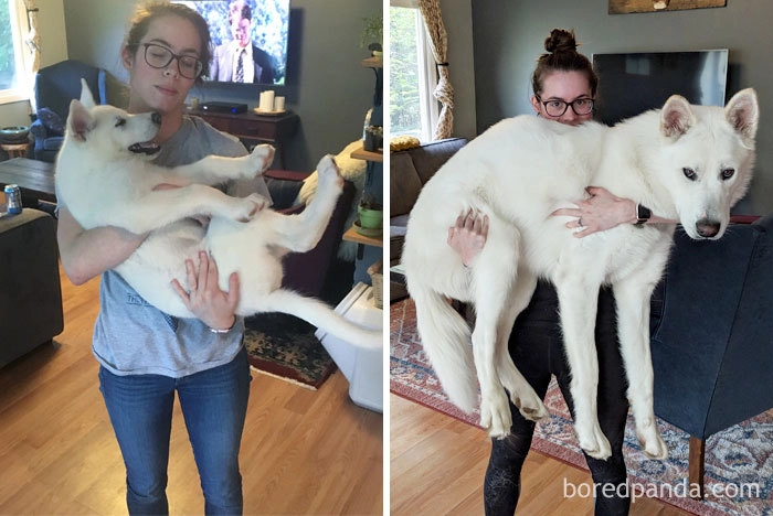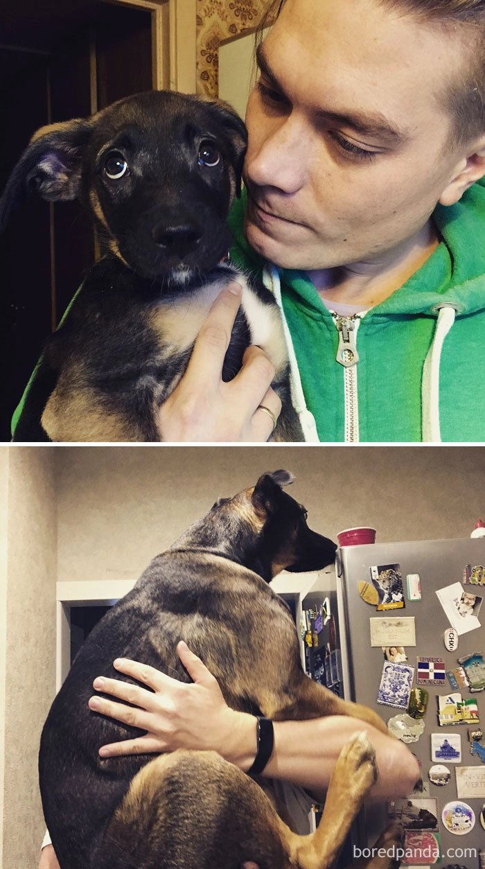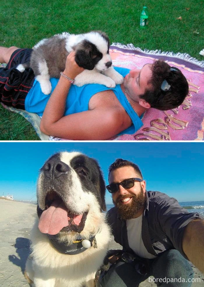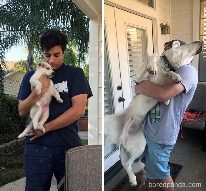 14. «Вот собака моего брата в тот день, когда я привёл его домой, а затем год спустя. Для масштаба: мой рост — 1,93 метра»