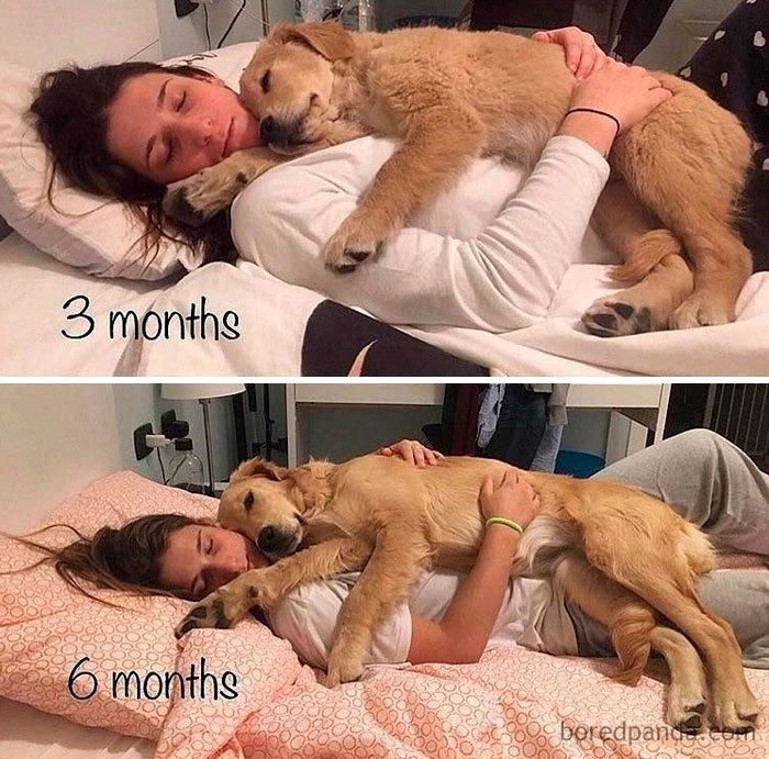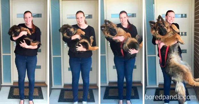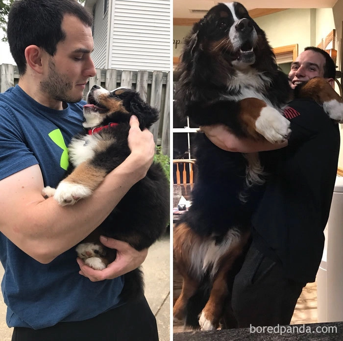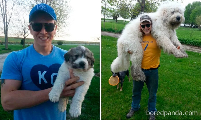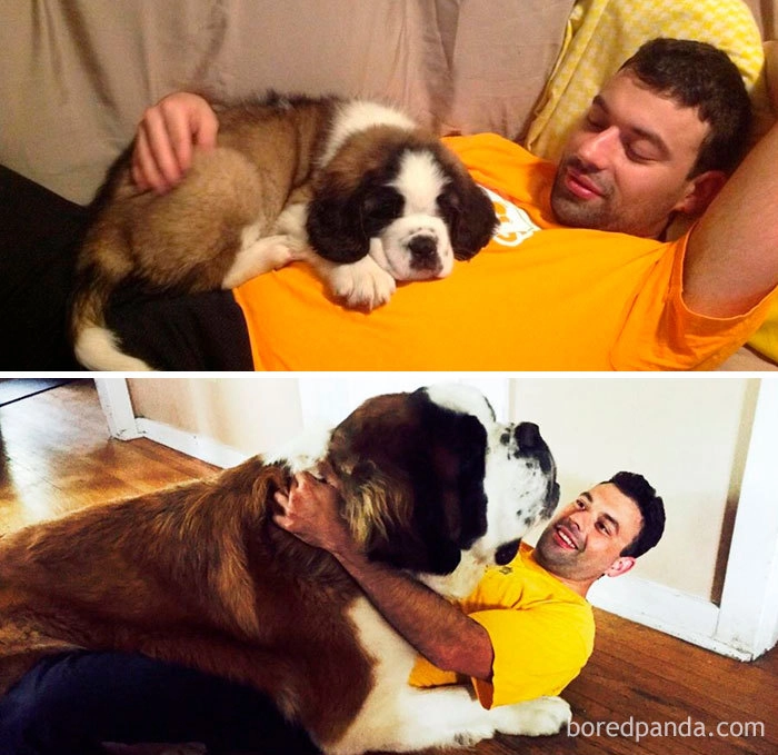 Щенки крупных пород растут очень быстро. Стоит пару раз моргнуть — и вот малыш, спавший клубочком у вас на коленках, превращается в огромного пса, который едва помещается на диван. Собрали для вас фотографии великолепных собак, которые так поразительно выросли, что стали больше своих владельцев. Эти снимки напоминают, что нужно дорожить каждым мгновением, проведённым с четвероногими друзьями.