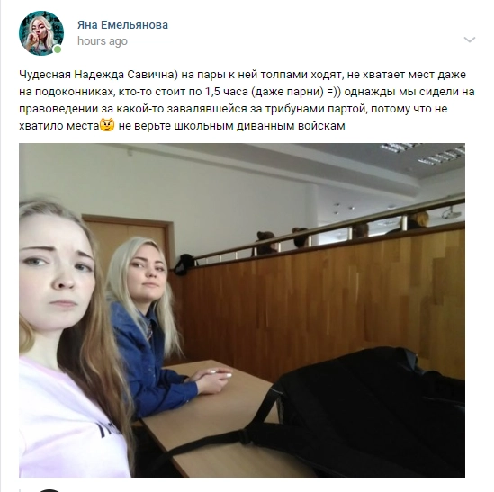 «Надежда Саввична — прекрасный педагог, который на 100 процентов знает свой предмет. И у нее есть то, чего нет у многих преподавателей, — заинтересовать студентов, — рассказала „Ридусу“ студентка УрГАХУ Валерия Левченко. — У нас ее пары не прогуливал почти никто. Просто информацию исказили ради шутки, а дальше все, как обычно бывает».