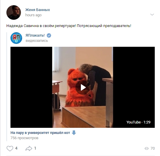 В ролике преподаватель диктует студентам вопросы, в это время с задних рядов спускается «кот» и подходит к женщине. Та умиляется, гладит «животное» и обнимает его. «Пожизненная сдача!» — произносит педагог.