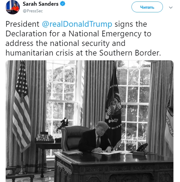 «Президент подписывает Декларацию о чрезвычайном положении в стране в целях национальной безопасности и устранения гуманитарного кризиса на южной границе», — написала Сандерс.