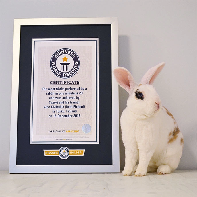 Домашний кролик из Финляндии по кличке Таави (Taawi) выполнил 20 трюков за 1 минуту и попал в Книгу рекордов Гиннеса. Четырёхлетний кролик перепрыгивал через препятствия, опрокинул бутылку, выполнил вращение, дал хозяину «пять», взял карты из рук и совершил много других удивительных трюков.