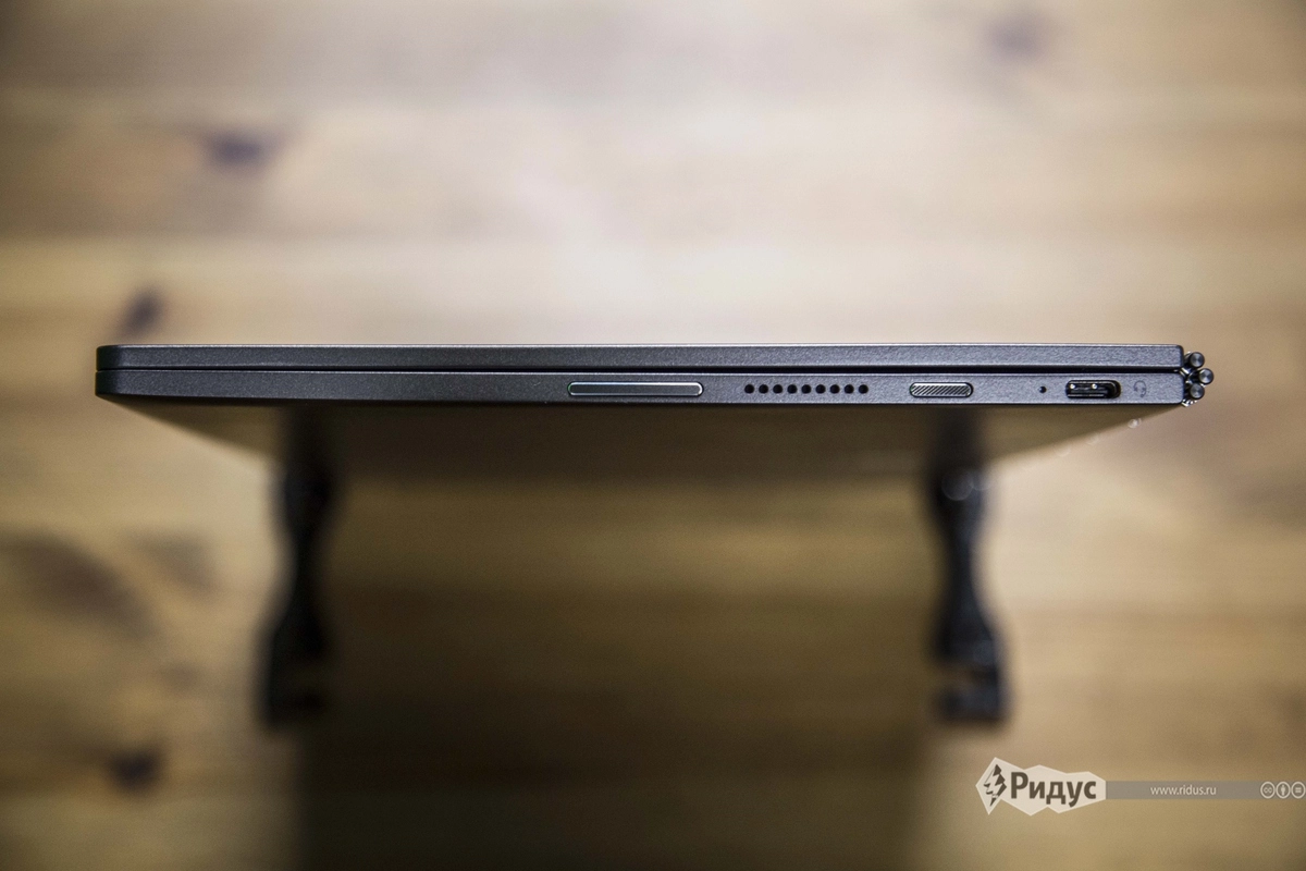 По сторонам разнесены стереодинамики и два USB Type-C, каждый из которых может использоваться для зарядки. Разъема для наушников здесь нет, зато на левой стороне находится лоток для карт памяти MicroSD объемом до 512 ГБ.