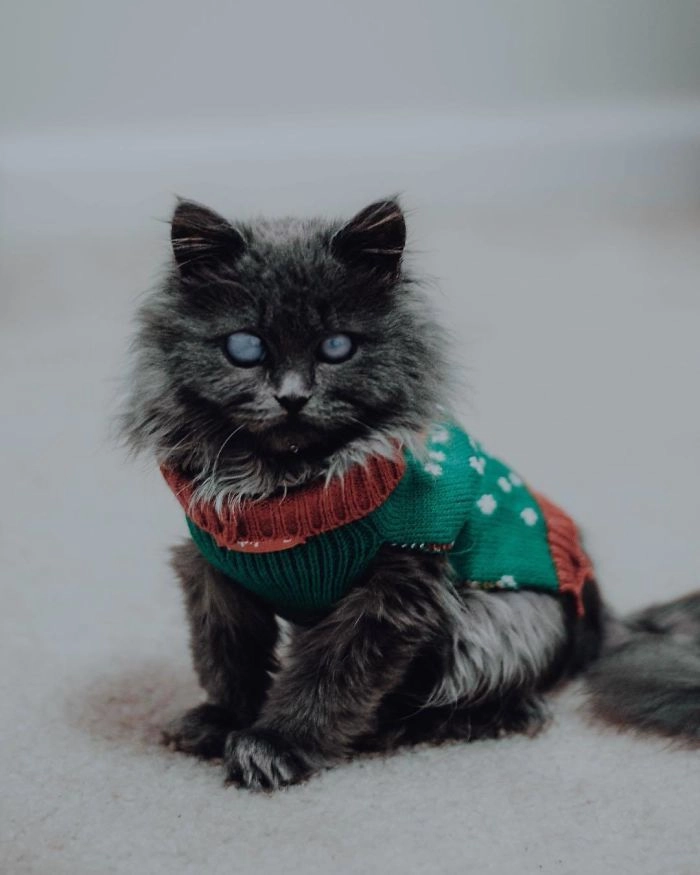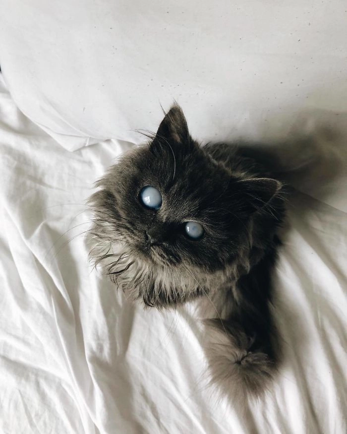 Знакомьтесь, это Мерлин (Merlin) — кот смешанных пород манчкин и персидской. У него сплющенная морда, короткие лапки, пушистая шерсть и глаза мистического голубого цвета, которые практически ничего не видят. Из-за необычной внешности котика сравнивают с Королём Ночи из сериала «Игра престолов».