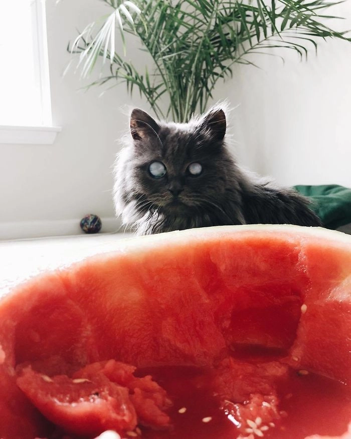 «Мерлин очень придирчивый, когда дело доходит до еды. Не любит рыбу или курицу. Зато обожает арбуз, поэтому мы часто его покупаем. Он любит ходить на прогулки и любит других животных. Он спит под покрывалами и обычно любит сидеть на приборной панели моей машины».