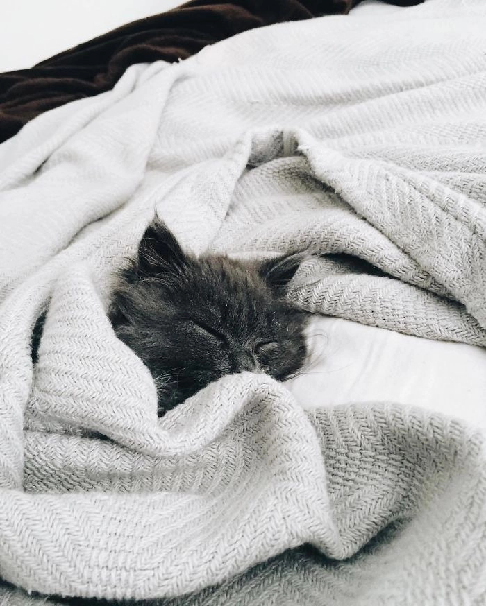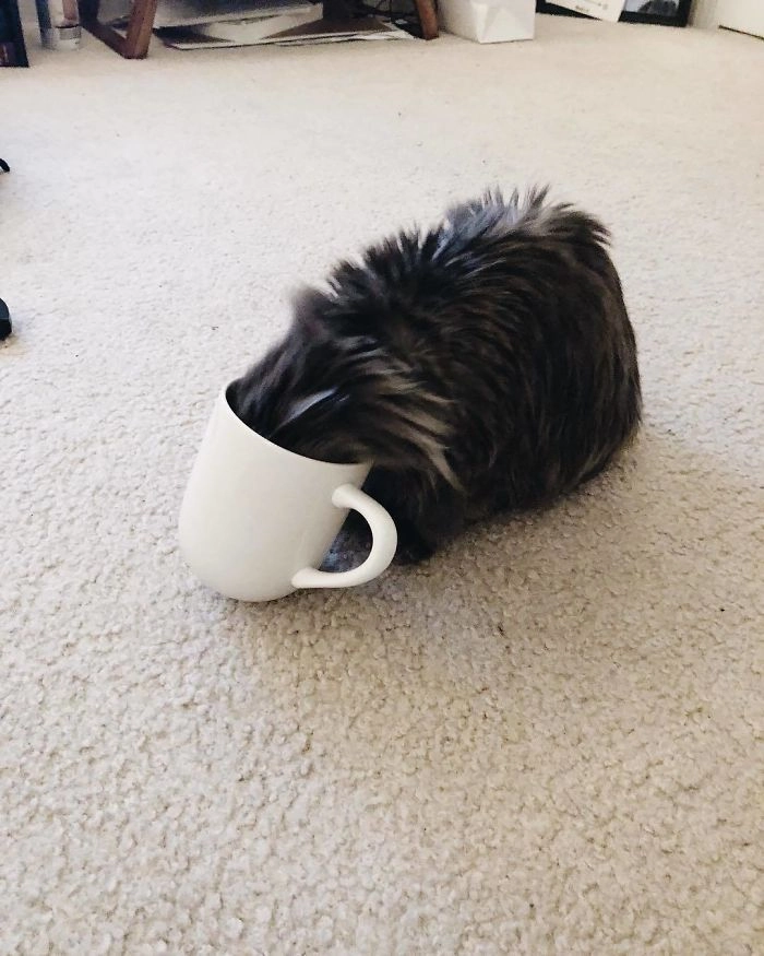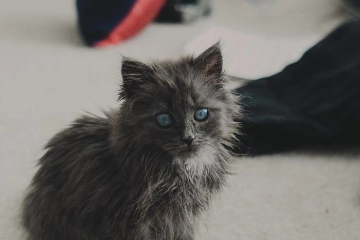 «Мы взяли Мерлина из приюта в возрасте нескольких недель. Он — результат скрещения двух редких пород — коротколапой манчкин и пушистой персидской. Мерлин размером с бутылку воды и почти ничего не видит».