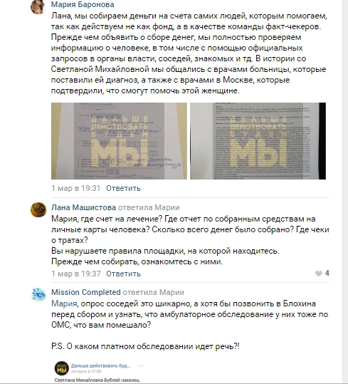 И если бы организаторы проекта, руководить которым пригласили Марию Баронову, захотели узнать экспертное мнение, то еще на стадии оформления идеи они бы обнаружили, что несостоятельность доводов «маме виднее, на что тратить» и «люди начинают просить помощи от отчаяния» подтверждена сотнями и тысячами сборов в социальных сетях.
